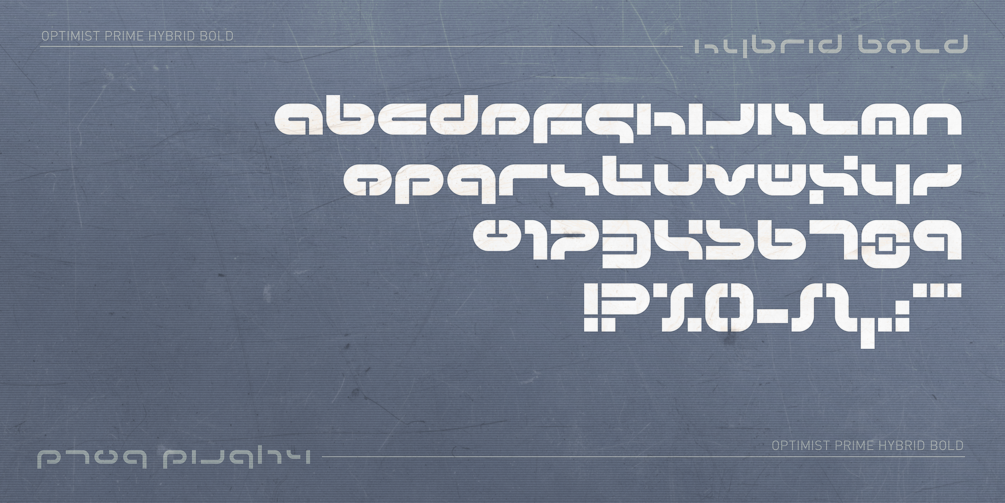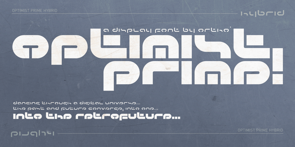 Optimist Prime! Hybrid flexes the rounded corners of the original, and introduces flat/box capped stroke terminals; elegantly balancing between the original Optimist Prime! and its alternate version, OP! Angular.